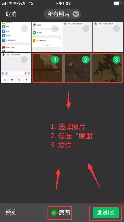 勾选底部“原图”(如未勾选,作品图片会被微信压缩成低像素图片);
